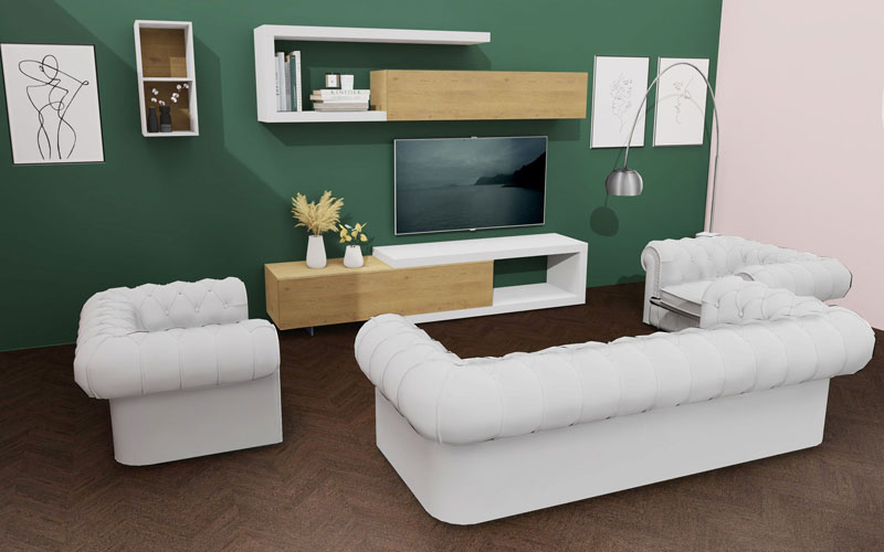 Propositions de projets pour un salon avec un système mural, un canapé et deux fauteuils