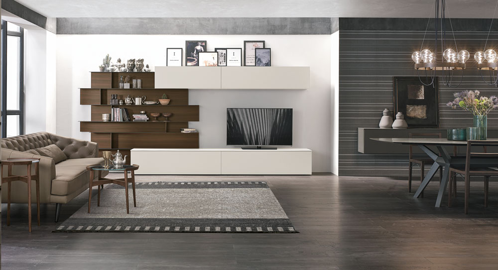 Propositions de projets pour un salon avec un système mural, un canapé et deux fauteuils