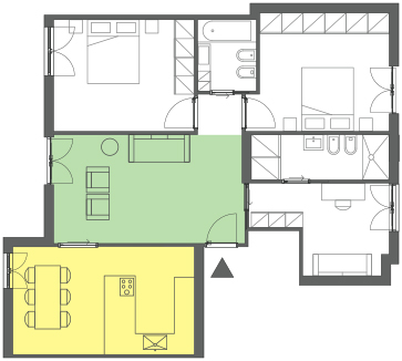 Salon relié à la cuisine, comme dans le cas des espaces ouverts. C’est l’une des solutions les plus demandées, où un ou plusieurs murs sont abattus pour créer de la légèreté, de la luminosité et optimiser les espaces.