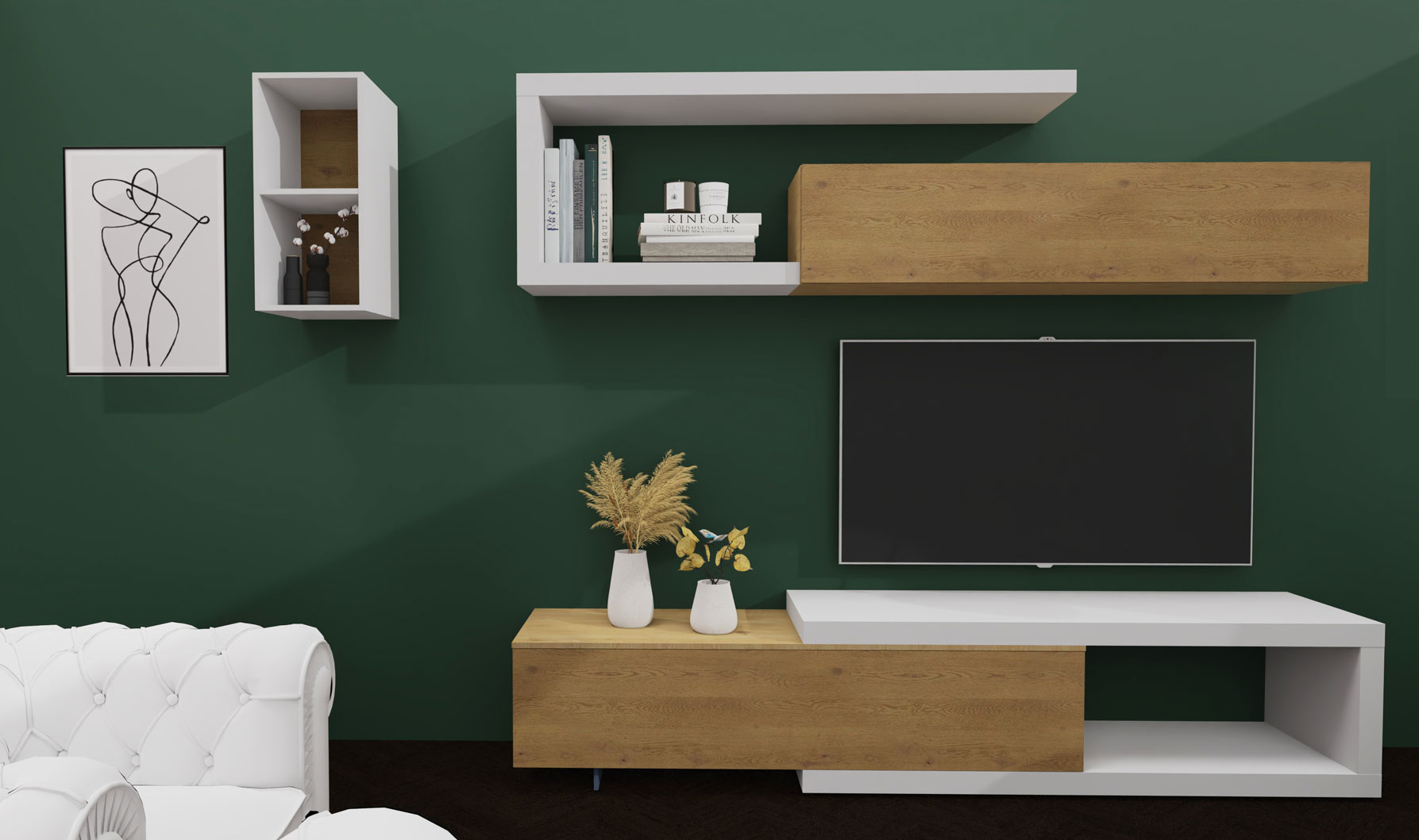 Cette composition utilise des éléments suspendus, modulaires et surtout personnalisables, caractérisés par une finition blanche opaque pour la structure porteuse et des détails en bois naturel, qui apportent chaleur et texture au design.