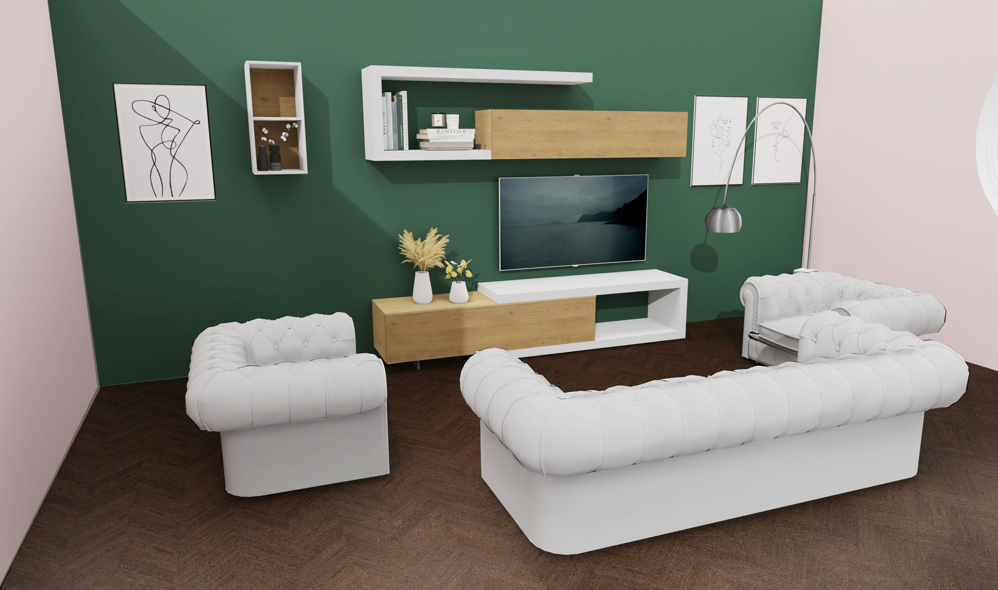 Le salon est meublé de trois canapés blancs en style Chesterfield, avec un revêtement matelassé et des formes enveloppantes, disposés en forme de lettre U autour du meuble mural, créant ainsi un espace convivial idéal pour se détendre ou pour discuter. Le système mural provient de la collection Lampo Sp60 de Sangiacomo, un système modulaire pour le salon, reconnaissable grâce à son design épuré et à la combinaison de finitions modernes.